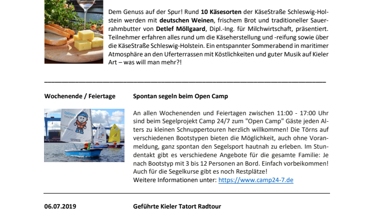 Dem Genuss auf der Spur! Rund 10 Käsesorten der KäseStraße Schleswig-Holstein werden mit deutschen Weinen, frischem Brot und traditioneller Sauerrahmbutter von Detlef Möllgaard, Dipl.-Ing. für Milchwirtschaft, präsentiert. Teilnehmer erfahren alles rund um die Käseherstellung und -reifung sowie über die KäseStraße Schleswig-Holstein. Ein entspannter Sommerabend in maritimer Atmosphäre an den Uferterrassen mit Köstlichkeiten und guter Musik auf Kieler Art – was will man mehr?!