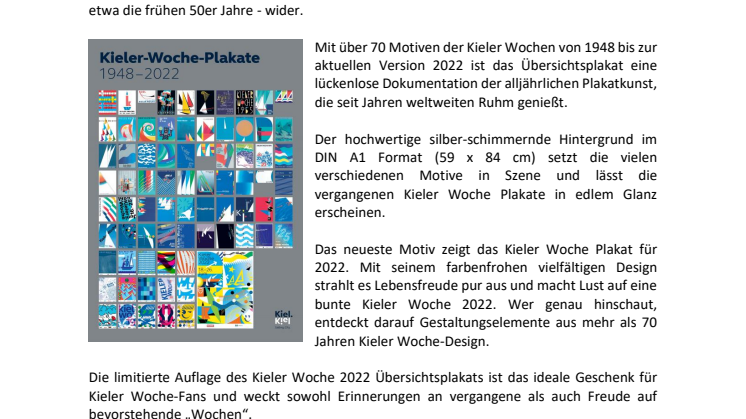Das neue Kieler Woche Übersichtsplakat zeigt die kreative Vielfalt und seglerische Interpretation der letzten Jahrzehnte. Es ist eine maritime Erinnerung der größten Segelsportveranstaltung der Welt und spiegelt oft auch einen künstlerischen Zeitgeist - wie etwa die frühen 50er Jahre - wider.