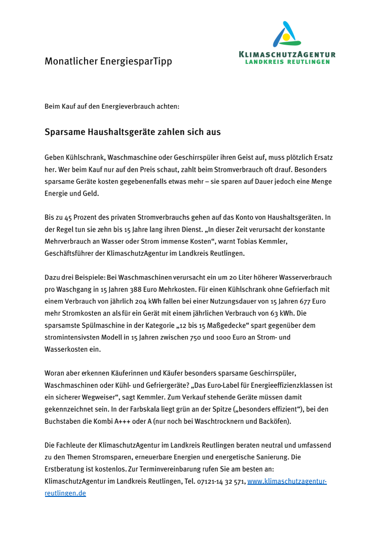 Bis zu 45 Prozent des privaten Stromverbrauchs gehen auf das Konto von Haushaltsgeräten. In der Regel tun sie zehn bis 15 Jahre lang ihren Dienst. „In dieser Zeit verursacht der konstante Mehrverbrauch an Wasser oder Strom immense Kosten“, warnt Tobias Kemmler, Geschäftsführer der KlimaschutzAgentur im Landkreis Reutlingen.