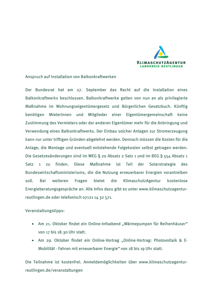 Der Bundesrat hat am 27. September das Recht auf die Installation eines Balkonkraftwerks beschlossen. Balkonkraftwerke gelten von nun an als privilegierte Maßnahme im Wohnungseigentümergesetz und Bürgerlichen Gesetzbuch. Künftig benötigen MieterInnen und Mitglieder einer Eigentümergemeinschaft keine Zustimmung des Vermieters oder der anderen Eigentümer mehr für die Anbringung und Verwendung eines Balkonkraftwerks. Der Einbau solcher Anlagen zur Stromerzeugung kann nur unter triftigen Gründen abgelehnt werden. Dennoch müssen die Kosten für die Anlage, die Montage und eventuell entstehende Folgekosten selbst getragen werden. Die Gesetzesänderungen sind im WEG § 20 Absatz 2 Satz 1 und im BEG § 554 Absatz 1 Satz 1 zu finden. Diese Maßnahme ist Teil der Solarstrategie des Bundeswirtschaftsministeriums, die die Nutzung erneuerbarer Energien vorantreiben soll. Bei weiteren Fragen bietet die KlimaschutzAgentur kostenlose Energieberatungsgespräche an. Alle Infos dazu gibt es unter www.klimaschutzagentur-reutlingen.deoder telefonisch 07121 14 32 571.