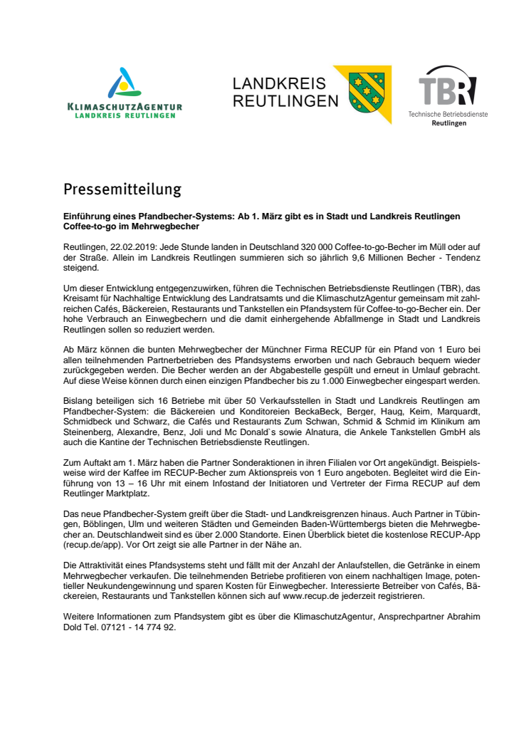 Um dieser Entwicklung entgegenzuwirken, führen die Technischen Betriebsdienste Reutlingen (TBR), das Kreisamt für Nachhaltige Entwicklung des Landratsamts und die KlimaschutzAgentur gemeinsam mit zahlreichen Cafés, Bäckereien, Restaurants und Tankstellen ein Pfandsystem für Coffee-to-go-Becher ein. Der hohe Verbrauch an Einwegbechern und die damit einhergehende Abfallmenge in Stadt und Landkreis Reutlingen sollen so reduziert werden.
