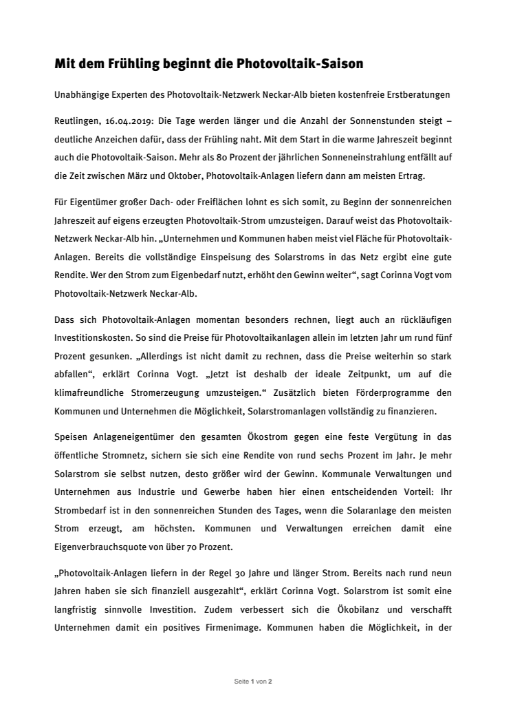 „Unternehmen und Kommunen haben meist viel Fläche für Photovoltaik-Anlagen. Bereits die vollständige Einspeisung des Solarstroms in das Netz ergibt eine gute Rendite. Wer den Strom zum Eigenbedarf nutzt, erhöht den Gewinn weiter“, sagt Corinna Vogt vom Photovoltaik-Netzwerk Neckar-Alb.