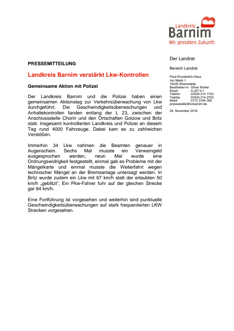 Der Landkreis Barnim und die Polizei haben einen gemeinsamen Aktionstag zur Verkehrsüberwachung von Lkw durchgeführt. Die Geschwindigkeitsüberwachungen und Anhaltekontrollen fanden entlang der L 23, zwischen der Anschlussstelle Chorin und den Ortschaften Golzow und Britz statt. Insgesamt kontrollierten Landkreis und Polizei an diesem Tag rund 4000 Fahrzeuge. Dabei kam es zu zahlreichen Verstößen.