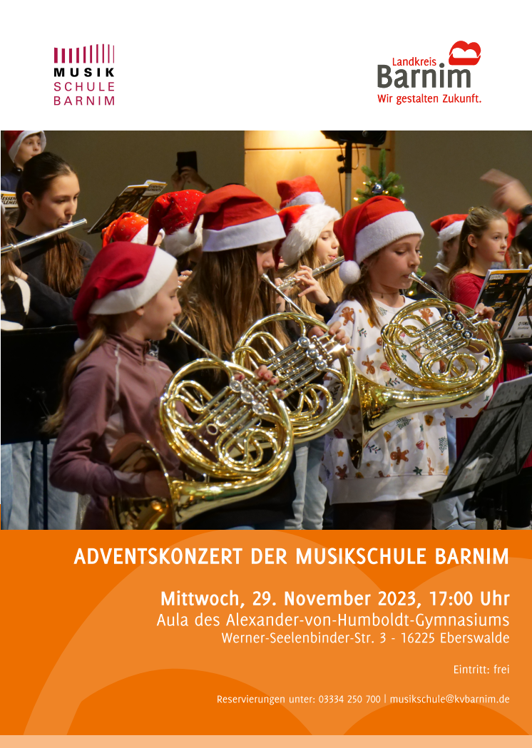 Einer guten Tradition folgend lädt die Musikschule Barnim auch in diesem Jahr in der vorweihnachtlichen Zeit zum Adventskonzert in die Aula des Alexander-von-Humboldt-Gymnasiums Eberswalde ein.