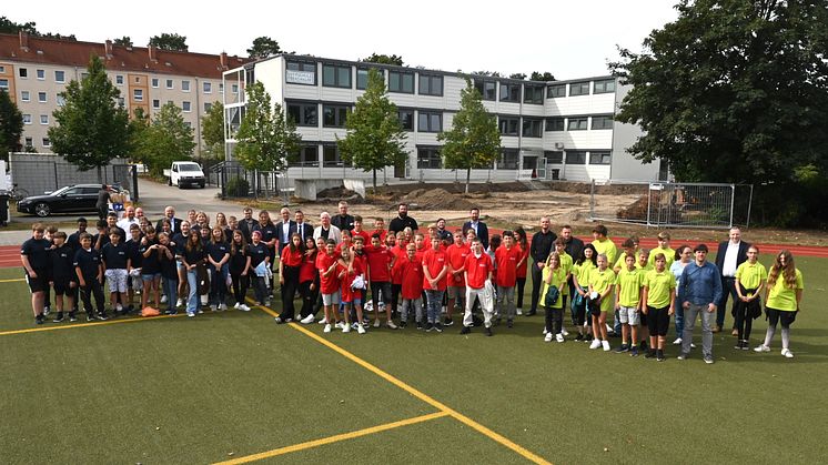 „Ich freue mich sehr, mich mit Euch gemeinsam auf den spannenden Weg zu machen, diese neue Schule mit Leben zu füllen und nach Euren Bedürfnissen weiterzuentwickeln“, sagte Schulleiter Max Sölter bei der Begrüßung der Schülerinnen und Schüler auf dem direkt an die Schule angrenzenden Sportplatz. „Mein Dank gilt Euch und Euren Eltern, die uns mit der Anwahl dieser neuen Schule ihr Vertrauen geschenkt haben. Zugleich bedanke ich mich bei den Verantwortlichen des Landkreises, beim Staatlichen Schulamt sowie bei allen am Bau Beteiligten, die bis zuletzt alle Hebel in Bewegung gesetzt haben, diese Schule in Rekordzeit zu realisieren.“