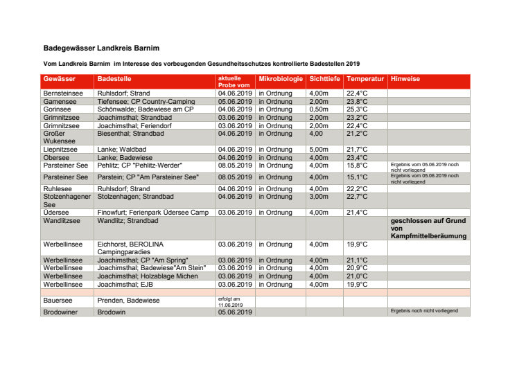 Die Wasserqualität der Barnimer Badeseen wird regelmäßig überprüft. Die Ergebnisse dieser Prüfungen werden vom Gesundheitsamt des Landkreises Barnim auch in diesem Jahr wieder für alle Bürger ersichtlich ins Netz gestellt.
