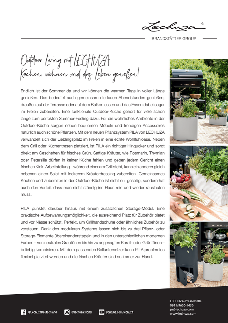 Endlich ist der Sommer da und wir können die warmen Tage in voller Länge genießen. Eine Outdoor-Küche gehört für viele schon lange zum perfekten Summer-Feeling dazu. Für ein wohnliches Ambiente sorgen neben bequemen Möbeln und trendigen Accessoires natürlich auch schöne Pflanzen. Mit dem Pflanzsystem PILA von LECHUZA verwandelt sich der Lieblingsplatz im Freien in eine echte Wohlfühloase.