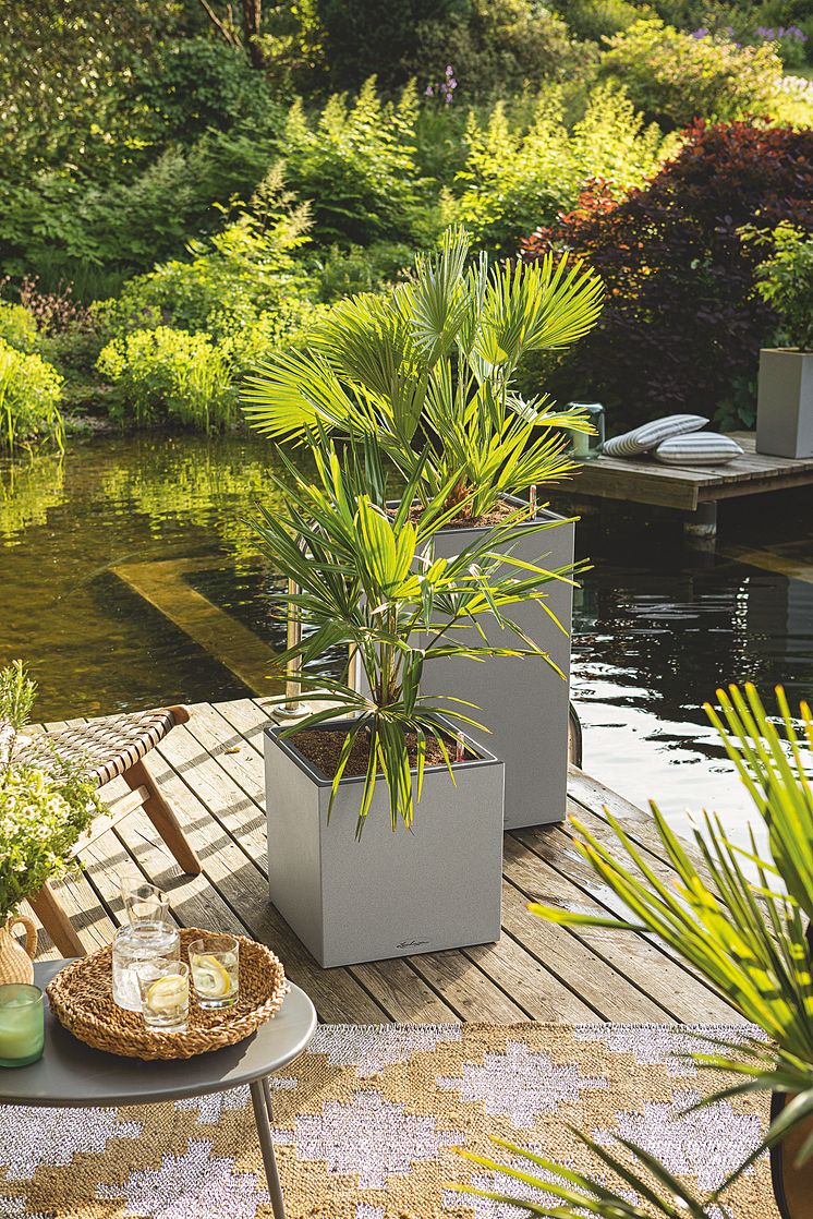 CANTO Stone LED von LECHUZA setzt die Pflanzen mit einem atmosphärischen Licht ins Szene.