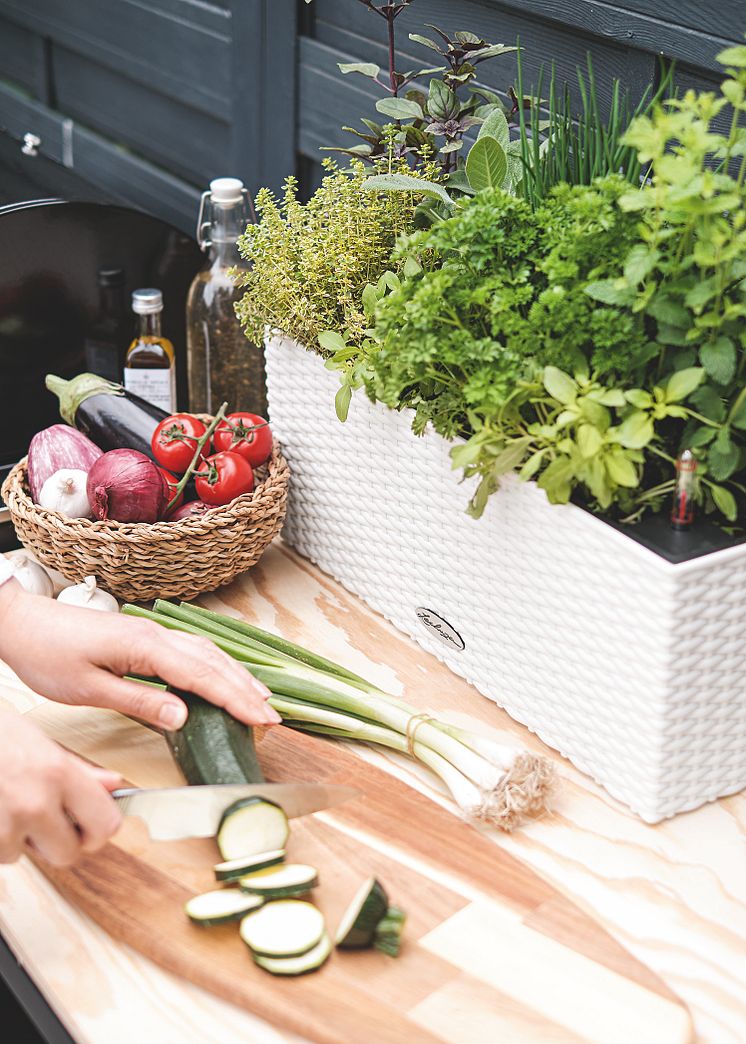 Gemeinsames Kochen und Zubereiten in der Outdoor-Küche ist nicht nur gesellig, sondern hat auch den Vorteil, dass man nicht ständig ins Haus rein und wieder rauslaufen muss. (LECHUZA BALCONERA Cottage 50 in weiß)