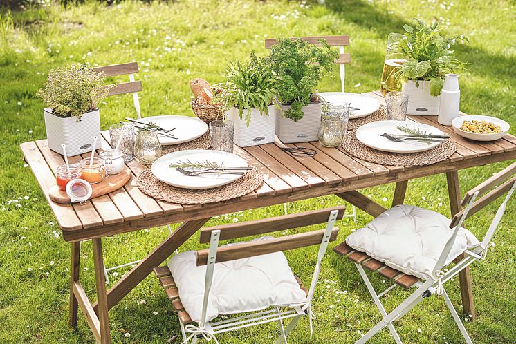 In der handlichen Größe passen die CUBE-Gefäße perfekt auf die Tafel und sorgen für frische Würze. (LECHUZA CUBE Color 14 in weiß und sandbraun)