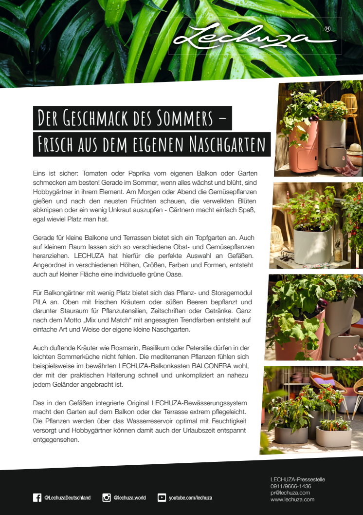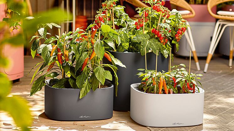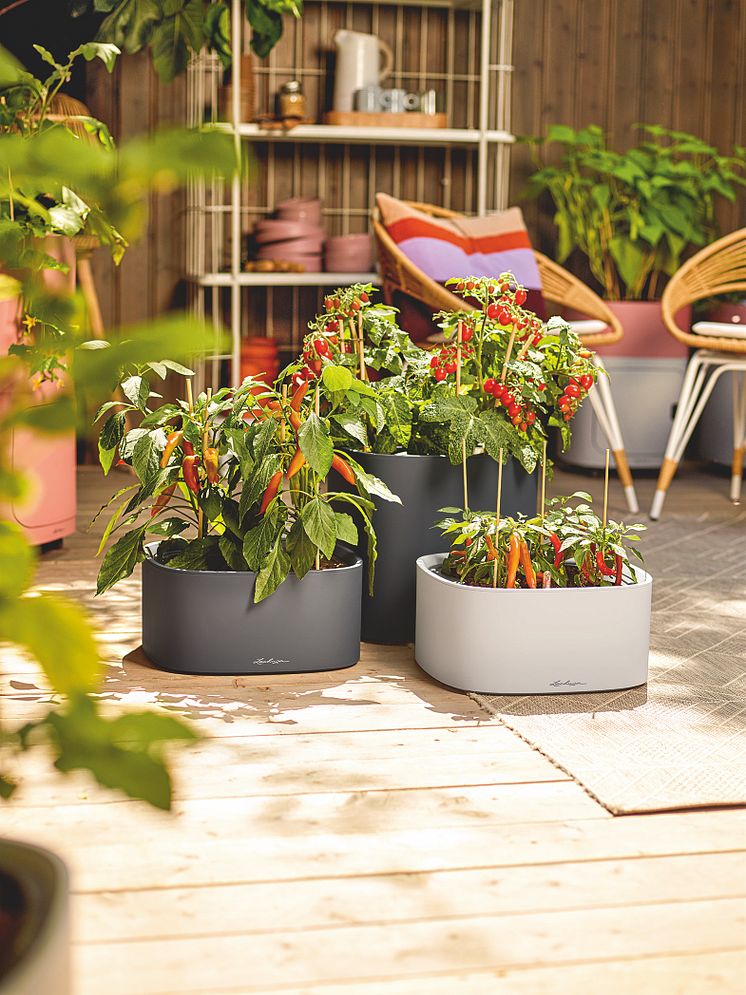 Gerade für kleine Balkone und Terrassen bietet sich ein Topfgarten an. Auch auf kleinem Raum lassen sich so verschiedene Obst- und Gemüsepflanzen heranziehen. LECHUZA hat hierfür die perfekte Auswahl an Gefäßen. Angeordnet in verschiedenen Höhen, Größen, Farben und Formen, entsteht auch auf kleiner Fläche eine individuelle grüne Oase.