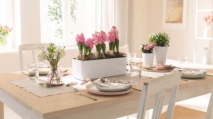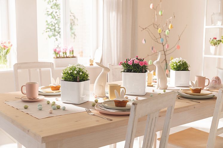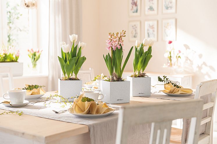 Ob Hyazinthen auf der Fensterbank oder Narzissen auf dem Esstisch – mit den LECHUZA-Pflanzgefäßen lassen sich Räume schnell und einfach dekorieren und frühlingshaft gestalten. Damit die Pflanzen nach dem Kauf lange frisch bleiben, versorgt das in den Gefäßen integrierte Bewässerungssystem sie zuverlässig mit Feuchtigkeit und der Wasserstandsanzeiger gibt an, wann wieder Zeit zum Gießen ist. Ein kreatives Gesteck mit Tulpen und Zweigen in der Schale CUBETO, ein kleines Hyazinthenbeet in CUBE Glossy Triple oder bunte Ranunkeln in DELTINI - der Fantasie sind bei der Gestaltung der Frühlingsboten keine Grenzen gesetzt.