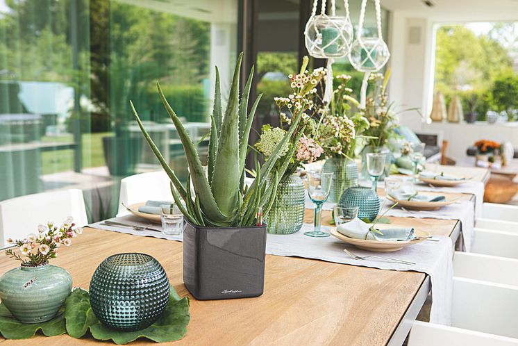 Für die Pause vom Alltag bieten sich ein Loungesessel oder eine große Liege mit gemütlichen Kissen an. Ein abgestimmtes Farbkonzept sorgt für ein harmonisches Ambiente, in dem man schnell zur Ruhe kommt und nach Herzenslust entspannen kann. Bunte Deko, ein großer Outdoorteppich und Windlichter bringen echtes Wohngefühl nach draußen und verpassen der Terrasse oder dem Garten einen gemütlichen Urlaubslook. Zahlreiche Pflanzen sind dabei die perfekten Ergänzungen. Mit den Pflanzgefäßen von LECHUZA lassen sich im Handumdrehen stylische Pflanzenparadiese schaffen, in denen dank integrierter Bewässerung Blumen und Grünpflanzen prächtig gedeihen und die Pflanzen auch an heißen Sommertagen optimal mit Feuchtigkeit versorgt sind.