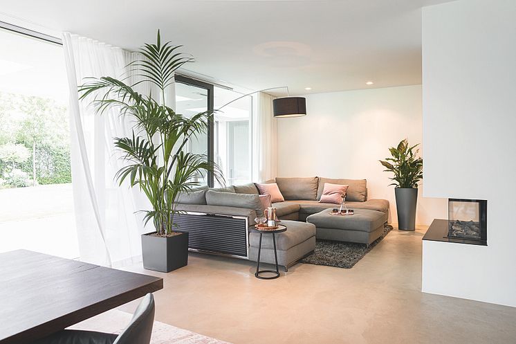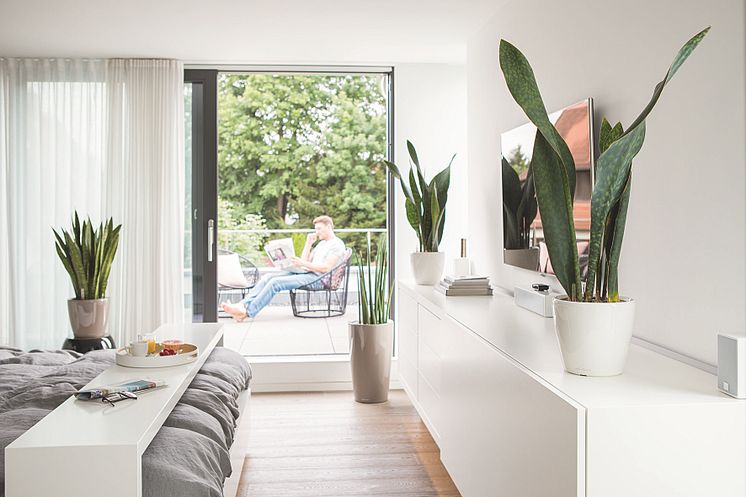 Zimmerpflanzen heitern mit ihrem vitalen Grün Räume auf und schaffen so Gemütlichkeit. Aber sie begeistern nicht nur optisch! Grünpflanzen wie Einblatt, Sanseviera & Co. geben fast 90 Prozent des Gießwassers zurück in die Zimmerluft, binden sogar Staubpartikel und wirken so wie Luftbefeuchter. Das tut vor allem im Herbst und Winter bei trockener Heizungsluft gut. Beim Urban Jungle-Trend ist alles erlaubt, was Freude macht. Große und exotische Pflanzen wie die angesagte Monstera oder die Goldfruchtpalme können in vielen Pflanzgefäßen nebeneinander in einem kleinen Dschungel gemeinsam arrangiert werden, pflegeleichte Sukkulentengärten mit Kakteen oder Echeverien passen toll auf Fensterbänke oder Regale und Solitäre mit ausgefallenen Blattformen und –farben wie Pilea, Calathea und Geigenfeige können als Highlights auf Sockeln inszeniert werden. Besonders trendy wird es mit einem eigenen vertikalen Indoor-Dschungel oder Makramee-Aufhängungen.