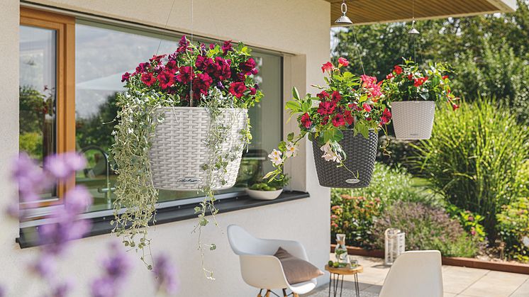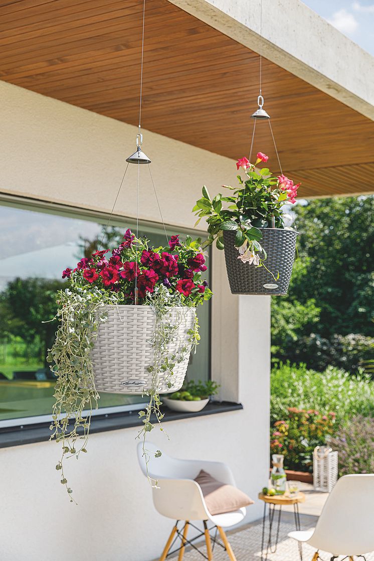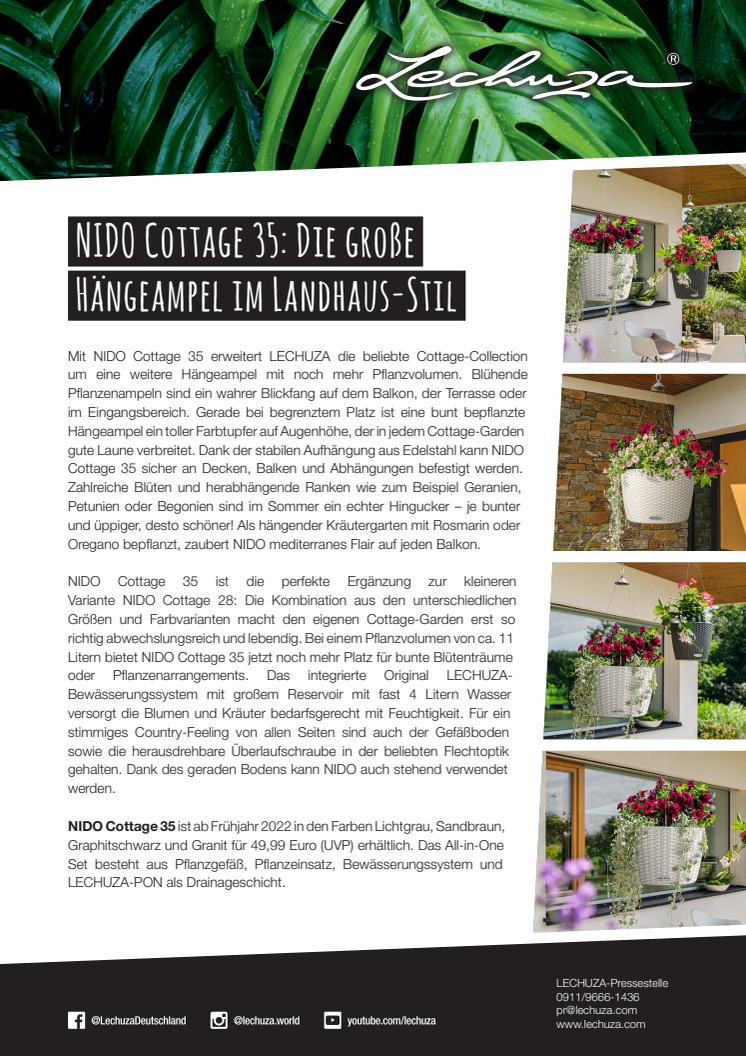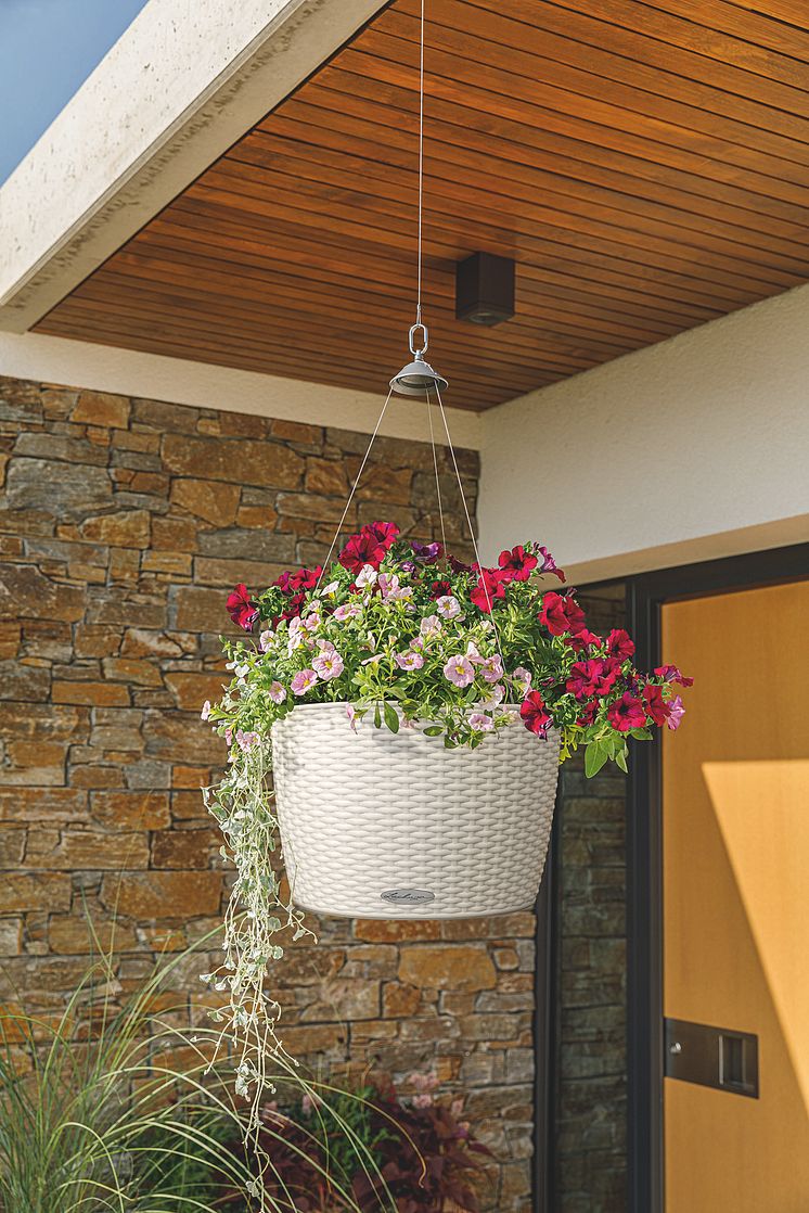 Mit NIDO Cottage 35 erweitert LECHUZA die beliebte Cottage-Collection um eine weitere Hängeampel mit noch mehr Pflanzvolumen. Blühende Pflanzenampeln sind ein wahrer Blickfang auf dem Balkon, der Terrasse oder im Eingangsbereich. Gerade bei begrenztem Platz ist eine bunt bepflanzte Hängeampel ein toller Farbtupfer auf Augenhöhe, der in jedem Cottage-Garden gute Laune verbreitet. Dank der stabilen Aufhängung aus Edelstahl kann NIDO Cottage 35 sicher an Decken, Balken und Abhängungen befestigt werden. Zahlreiche Blüten und herabhängende Ranken wie zum Beispiel Geranien, Petunien oder Begonien sind im Sommer ein echter Hingucker – je bunter und üppiger, desto schöner! Als hängender Kräutergarten mit Rosmarin oder Oregano bepflanzt, zaubert NIDO mediterranes Flair auf jeden Balkon.