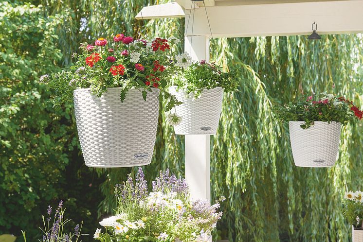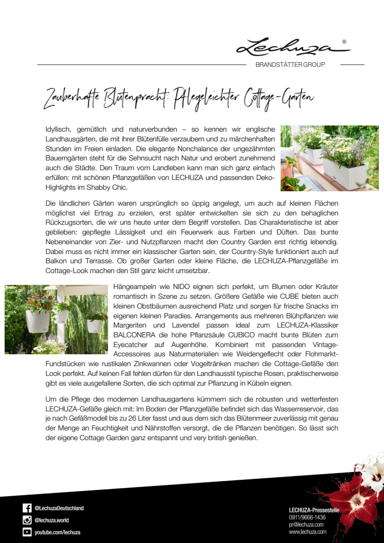 Hängeampeln wie NIDO eignen sich perfekt, um Blumen oder Kräuter romantisch in Szene zu setzen. Größere Gefäße wie CUBE bieten auch kleinen Obstbäumen ausreichend Platz und sorgen für frische Snacks im eigenen kleinen Paradies. Arrangements aus mehreren Blühpflanzen wie Margeriten und Lavendel passen ideal zum LECHUZA-Klassiker BALCONERA die hohe Pflanzsäule CUBICO macht bunte Blüten zum Eyecatcher auf Augenhöhe. Kombiniert mit passenden Vintage-Accessoires aus Naturmaterialien wie Weidengeflecht oder Flohmarkt-Fundstücken wie rustikalen Zinkwannen oder Vogeltränken machen die Cottage-Gefäße den Look perfekt. Auf keinen Fall fehlen dürfen für den Landhausstil typische Rosen, praktischerweise gibt es viele ausgefallene Sorten, die sich optimal zur Pflanzung in Kübeln eignen.