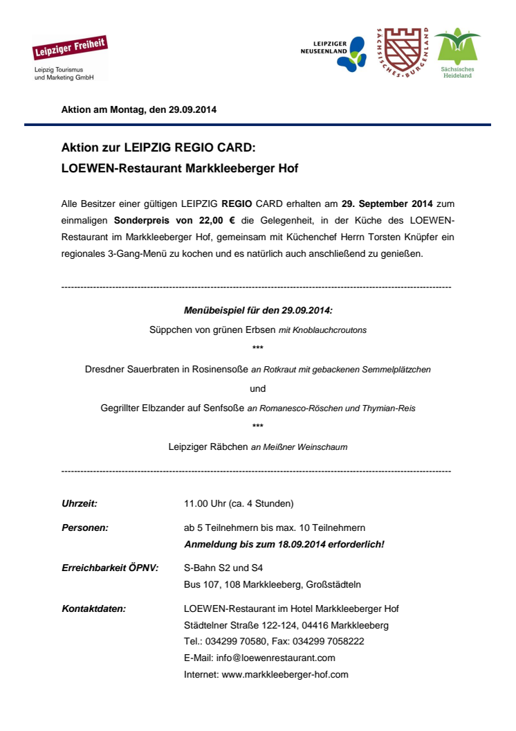 Aktionsangebot Hotel Markkleeberger Hof 29.09.2014