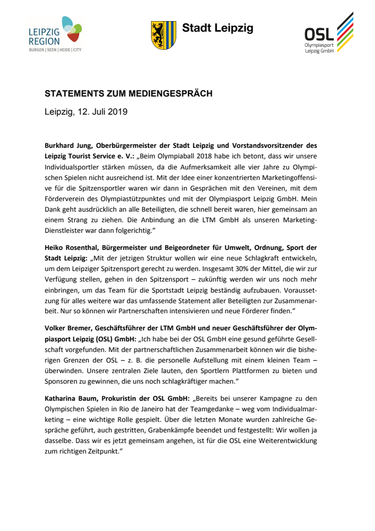 Die Stadt Leipzig wird zukünftig mit der Marketingoffensive „Eine Stadt - ein Team“ den Spitzensport nachhaltiger unterstützen und fördern. Gemeinsam mit der Olympiasport Leipzig (OSL) GmbH und der Leipzig Tourismus und Marketing (LTM) GmbH werden deshalb neue Strukturen geschaffen.