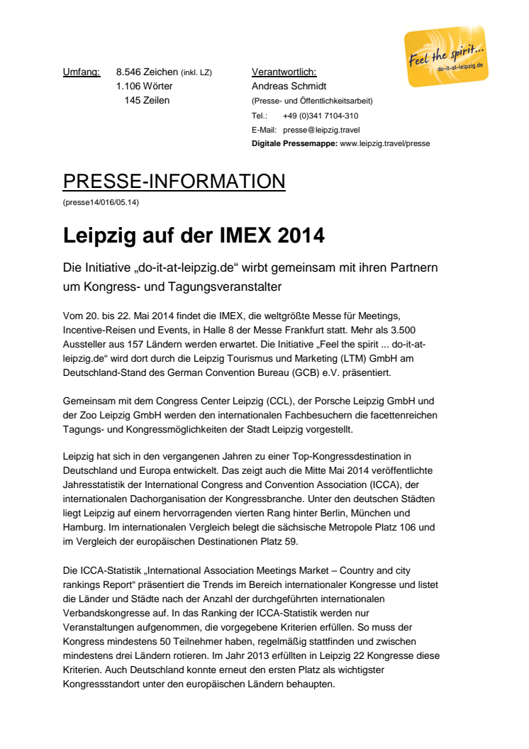 Die Kongressinitiative "do-it-at-leipzig" stellt vom 20. bis 22. Mai 2014 auf der IMEX in Frankfurt die vielfältigen Tagungs- und Kongressmöglichkeiten der Stadt Leipzig vor. Laut der aktuellen ICCA-Statistik belegt Leipzig bei der Ausrichtung Internationaler Kongresse im nationalen Vergleich den vierten Rang.