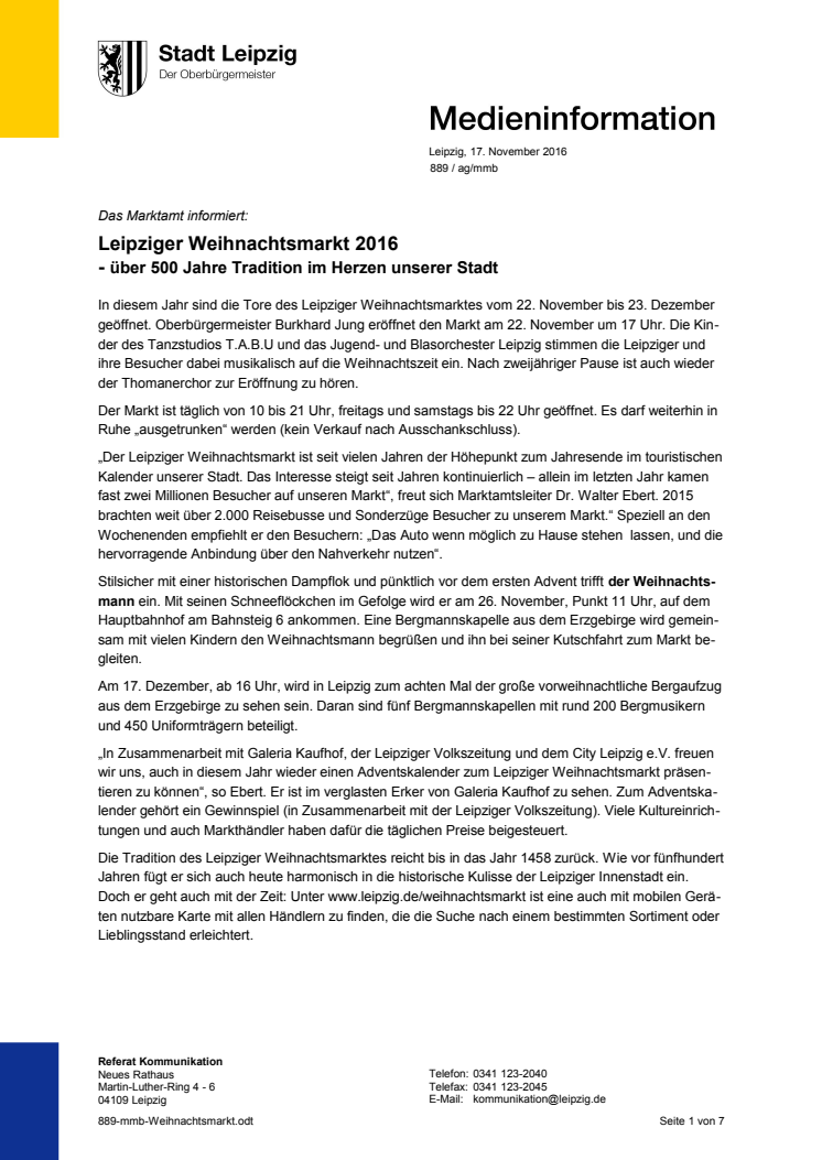 Pressemitteilung vom Marktamt Leipzig: Weihnachtsmarkt 2016
