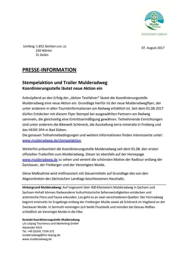 Die Koordinierungsstelle Mulderadweg läutet eine neue Aktion ein. Seit dem 01.08.2017 dürfen Entdecker mit einem Flyer zum Mulderadweg Stempel bei ausgewählten Partnern am Radweg sammeln, die gleichzeitig eine Eintrittsermäßigung gewähren.