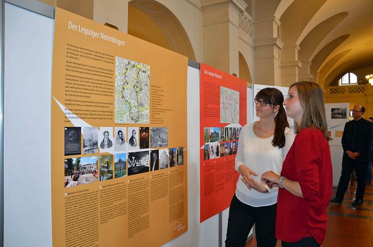 Besucherinnen an der Informationstafel zum Leipziger Notenrad und dem Leipziger Notenbogen