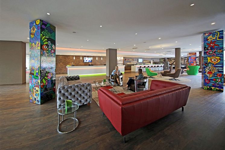 Couchlandschaft im Retro-Look und mit Fischer-Art verzierte Säulen