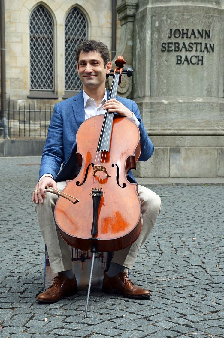 Dale Henderson vorm Bach Denkmal an der Thomaskirche, der langjährigen Wirkungsstätte Bachs