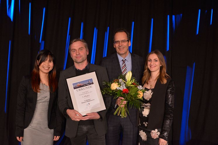Den dritten Platz in der Kategorie Unternehmen erhält die Baumwollspinnerei. Michael Ludwig (2.v.l.) (Pressesprecher der Baumwollspinnerei und Geschäftsführer der Luru Kinos) nimmt den Preis entgegen.