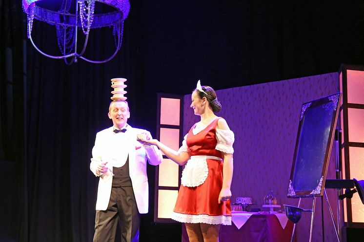 Der Gentleman-Jongleur Jens Thorwächter alias Jeton mit seiner Assistentin im Wintervarieté "Café Mélange"