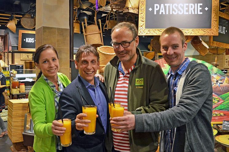 Die drei Säulen des Sommerkabaretts v.l.: Susann Boberski (Marché Restaurant Patakan), Thorsten Wolf (Leipziger Funzel), Dirk Eisold (Veranstalter Zoo Leipzig) und Christian Schöne (Eventmanager Zoo Leipzig)