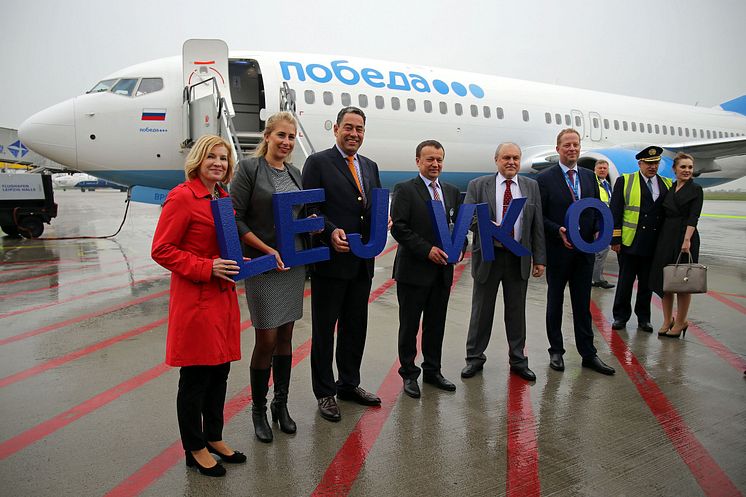 Die Repräsentanten begrüßten den Premierenflug der Pobeda-Airline auf dem Flughafen Leipzig/Halle