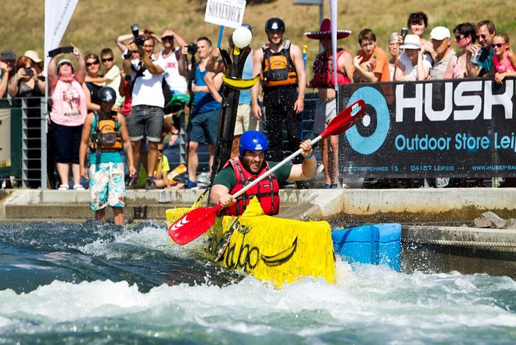 Die Teilnehmer schlagen sich durch das wilde Wasser beim Pappbootrennen im Kanupark Markleeberg