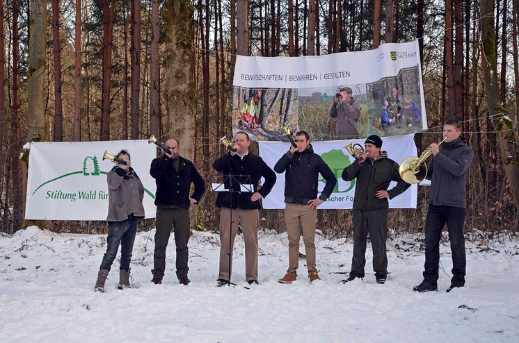 Die Wermsdorfer Jagdhornbläser spielen zur Eröffnung des Aktionsjahres „Waldgebiet des Jahres 2018“