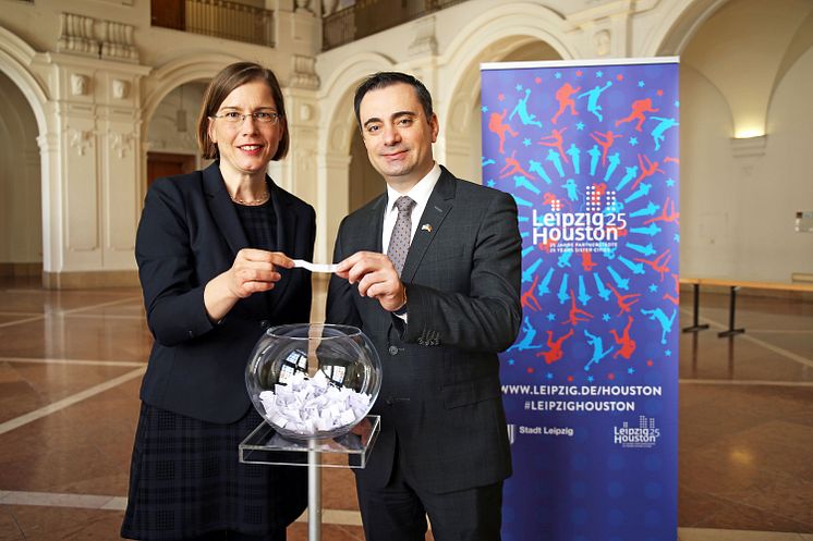 Dr. Skadi Jennicke und Timothy Eydelnant bei der Verlosung im Neuen Rathaus