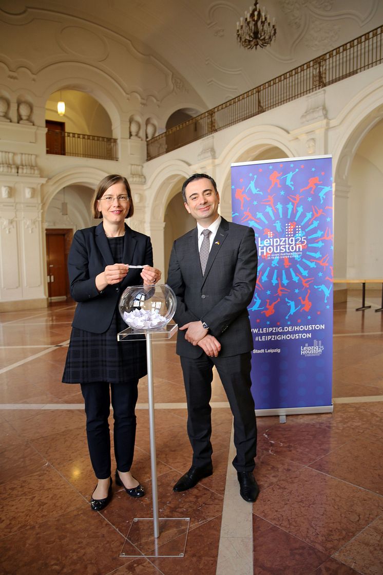 Dr. Skadi Jennicke und Timothy Eydelnant losten zwei glückliche Gewinner, die Leipzig entdecken können