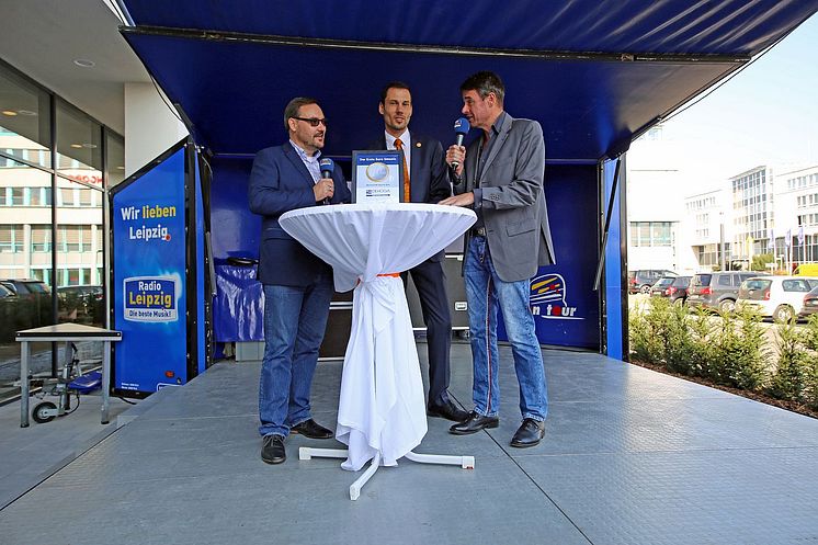 Eröffnung des LOGINN by Achat: Holm Retsch (DEHOGA), Marcus Köhler (Direktor) und Roman Knoblauch (Radio Leipzig)