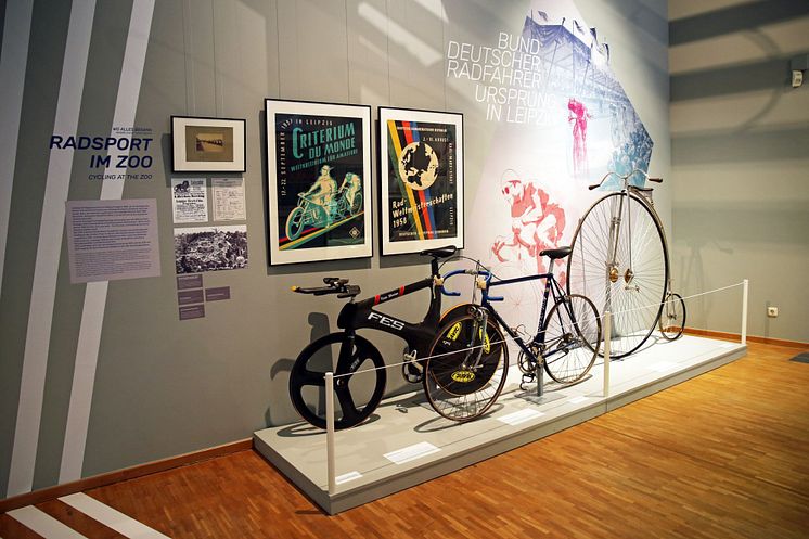 Fahrräder von Jens Lehmann und Uwe Ampler sowie ein Hochrad in der Ausstellung "In Bewegung - Meilensteine der Leipziger Sportgeschichte"