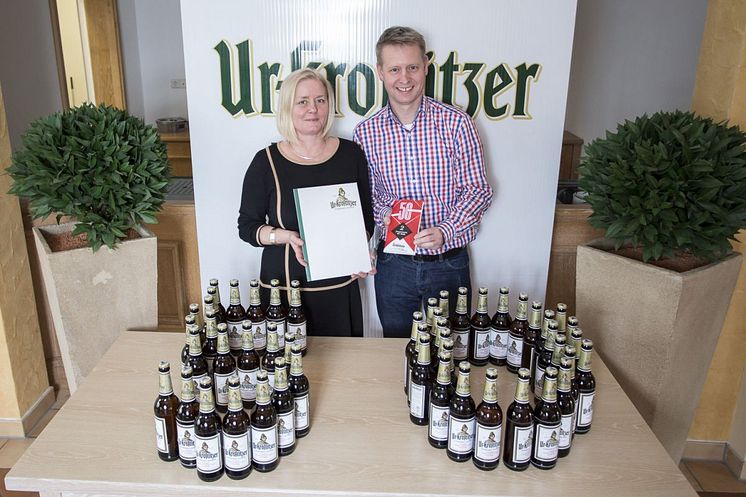 Geschäftsführerin der academixer Dörte Waurick und Betriebsleiter der Krostitzer Brauerei Sascha Marre feiern das Jubiläum