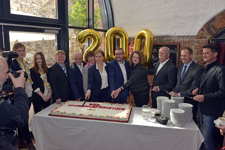 Kulturbürgermeisterin Dr. Skadi Jennicke (m.) und Gäste der ersten Stunde schneiden die Jubiläumstorte zum 200. Tourismusfrühstück an