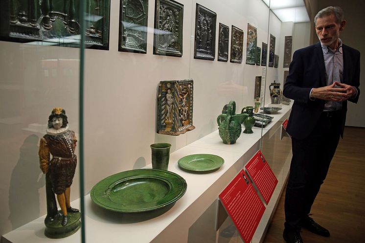 Kurator Dr. Thomas Rudi zeigt u.a. den von Kurfürst Friedrich III. von Sachsen und Martin Luther flankierten Wandwasserbehälter in der Ausstellung "Gottes Werk und Wort vor Augen" im GRASSI Museum für Angewandte Kunst Leipzig