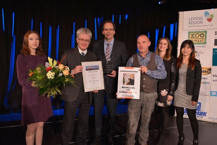 Prof. Dr. Peter Wollny (2.v.l.) nimmt als Direktor des Bach-Archivs Leipzig den Tourismuspreis 2017 entgegen. Michael Berninger (3.v.r.) von der Culturträger GmbH präsentiert die gesponserte Werbeleistung.