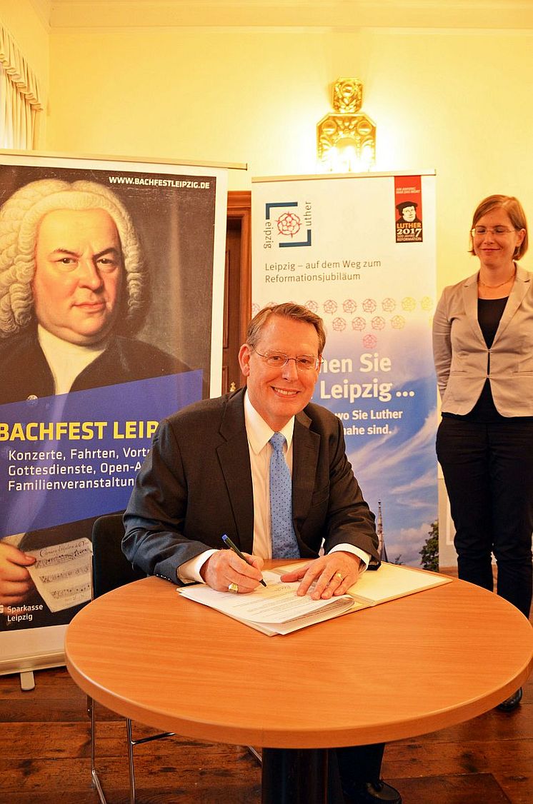 Reverend Dr. Robert Moore unterzeichnet seinen Vertrag als Leipzigs Reformationsbotschafter