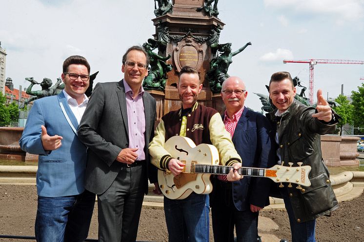 Sie freuen sich auf das „Leipziger Stadtfest 2017“: Leipzigs beliebte Band „Firebirds“ sowie Volker Bremer (Leipzig Tourismus und Marketing GmbH, 2.v.l.) und Bernd Hochmuth (Gesamtorganisator des Leipziger Stadtfestes, 2.v.r.)