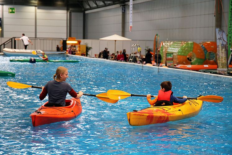 Trainer bringen kleinen Wassersportfans das Kajakfahren bei