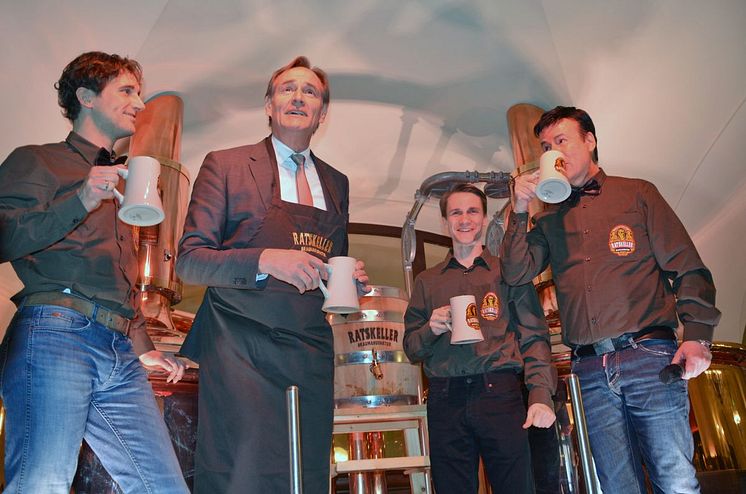 v.l.: Jan Woithon, Burkhard Jung, Norman Jung und Ingo Winkler genossen nach dem ersten Fass-Anstich das "Lotteraner"-Bier