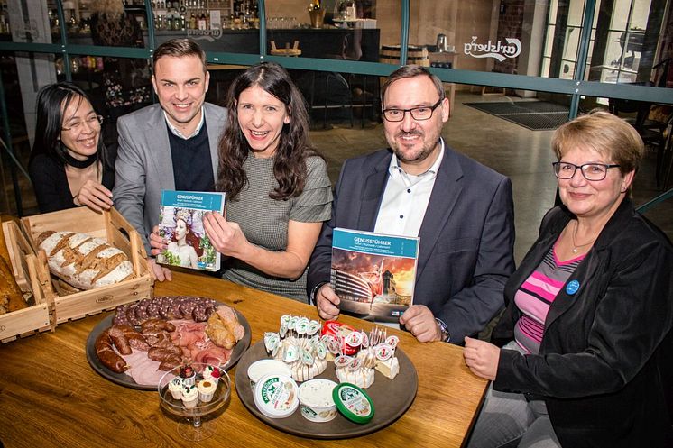 v.l.: Minh Chau Le Thi, Daniel Reinhardt, Christine Klauder, Holm Retsch und Dr. Elke Leinhoß präsentieren den neuen Genussführer in der La Fonderie in Leipzig