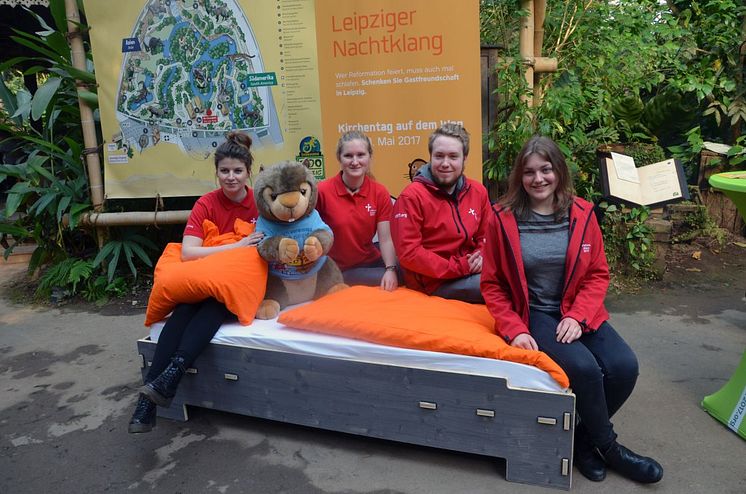 Vier Volunteers sind mit Bett und Murmeltier Mandy ins Gondwanaland im Zoo Leipzig gereist