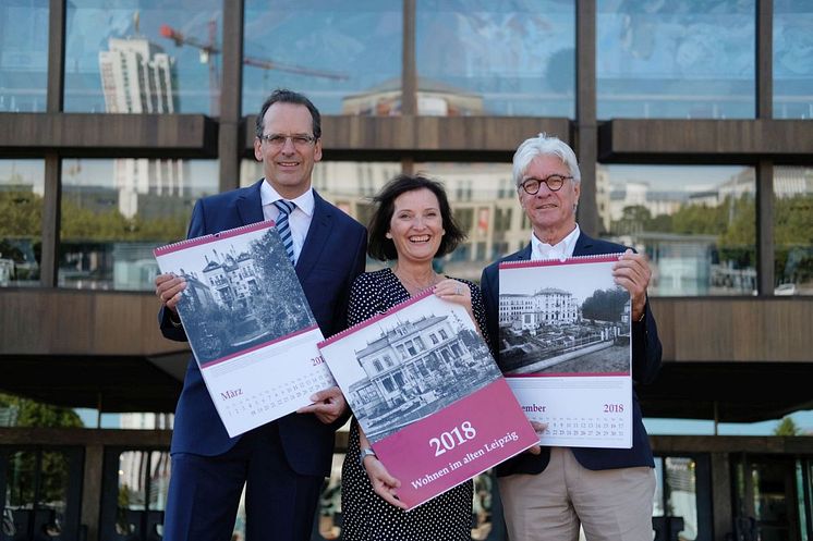 Volker Bremer und Marit Schulz (LTM GmbH) präsentieren gemeinsam mit Dr. Volker Rodekamp (Stadtgeschichtliches Museum Leipzig) vor dem Gewandhaus den Historischen Kalender 2018