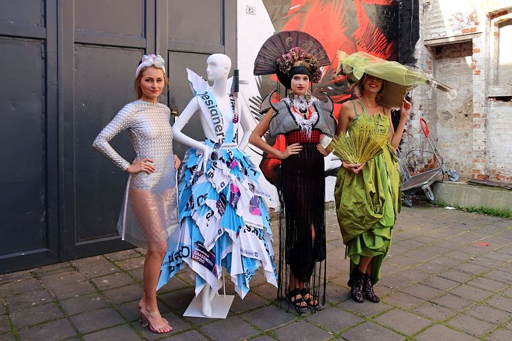 Vorstellung der Mode-Kollektion der Freien Akademie Köln: Das Waschsalon-Outfit "in vacuum" von Franziska Munsch, das 'Geisha'-Kleid von Marco Stern und das grüne Seidenkleid in Kombination mit einem Hut aus einer Badematte von Jana Wahn (v.l.n.r)